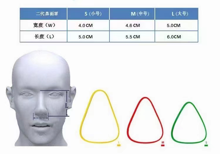 口鼻面罩主要對口角寬度、鼻梁寬度、下唇寬度進行定標測量,使用時嘴巴微微張開,確保鼻面罩密封墊的上端不要高于鼻梁區(qū)域。