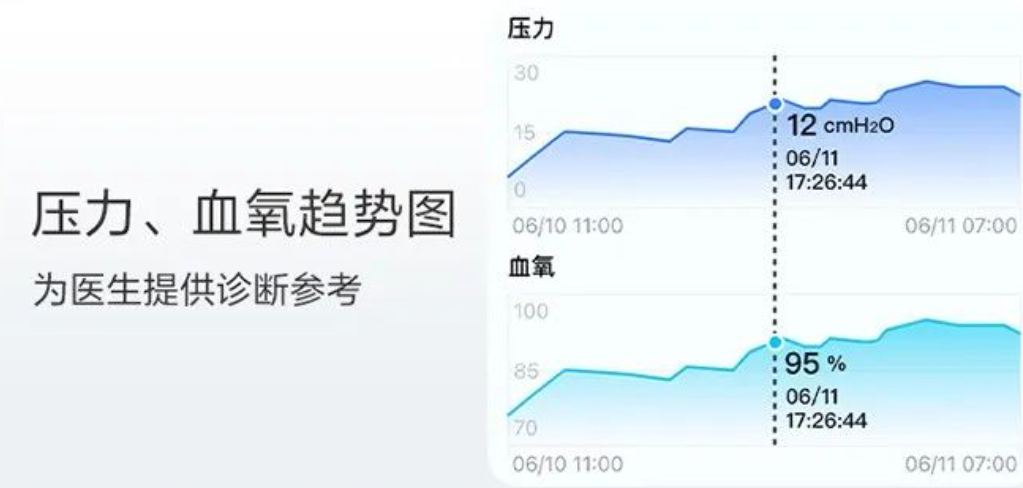 - 準確識別 OA,CA,H,LL 等呼吸事件,智能調(diào)節(jié)提供更舒適呼吸體驗。